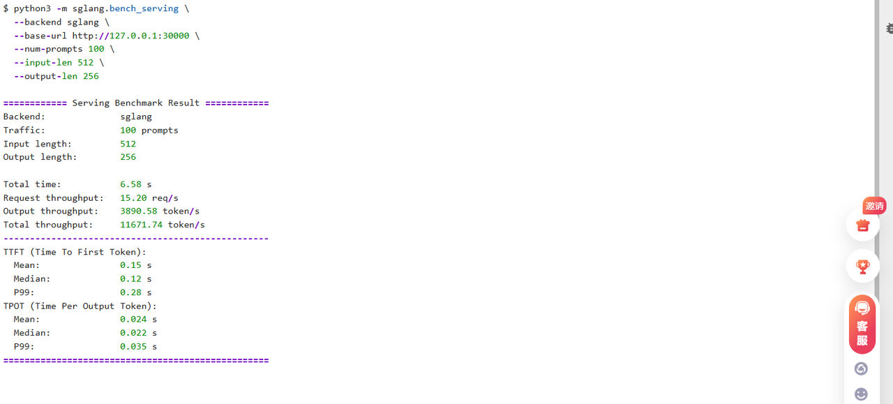 # 模拟 100 个并发请求,输入 512 token,输出 256 token