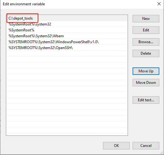 - 关键步骤 :点击"上移"按钮,将 depot_tools 路径移到列表的最顶端