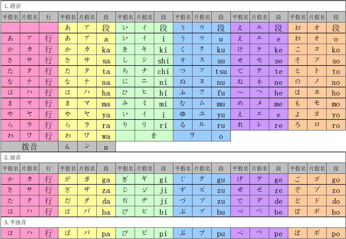 | 类别 | 行 | 片假名 | 平假名 | 罗马音 | 片假名 | 平假名 | 罗马音 | 片假名 | 平假名 | 罗马音 | 片假名 | 平假名 | 罗马音 | 片假名 | 平假名 | 罗马音 |