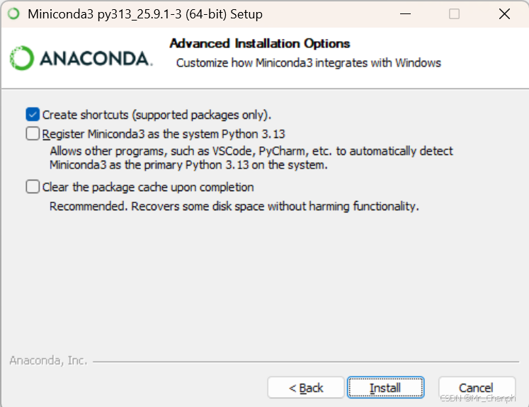 - 本机已经装了好几个Python3.9~3.13,在VsCode上使用也很正常。不想打破原有环境,装Miniconda3,不加到系统环境path种,如下图安装: