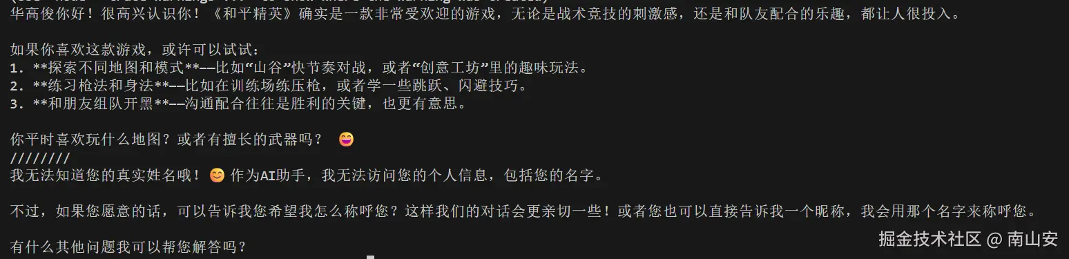 const res1 = await model.invoke("我叫华高俊,喜欢打和平精英");