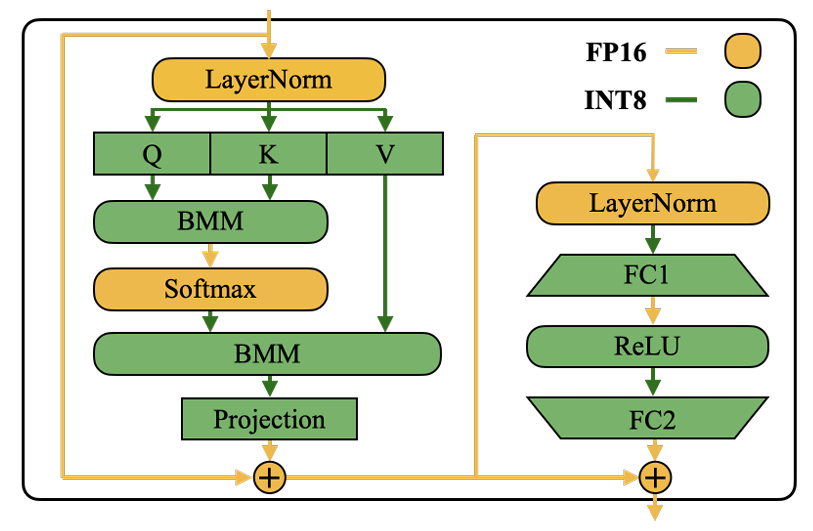 上图详细展示了SmoothQuant在Transformer block中的精度分配:
