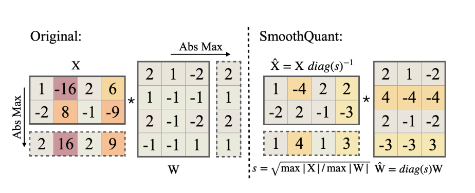 Y=X⋅W=(X⋅diag(s)−1)⋅(diag(s)⋅W)=X^⋅W^Y = X \cdot W = (X \cdot \text{diag}(s)^{-1}) \cdot (\text{diag}(s) \cdot W) = \hat{X} \cdot \hat{W}Y=X⋅W=(X⋅diag(s)−1)⋅(diag(s)⋅W)=X^⋅W^