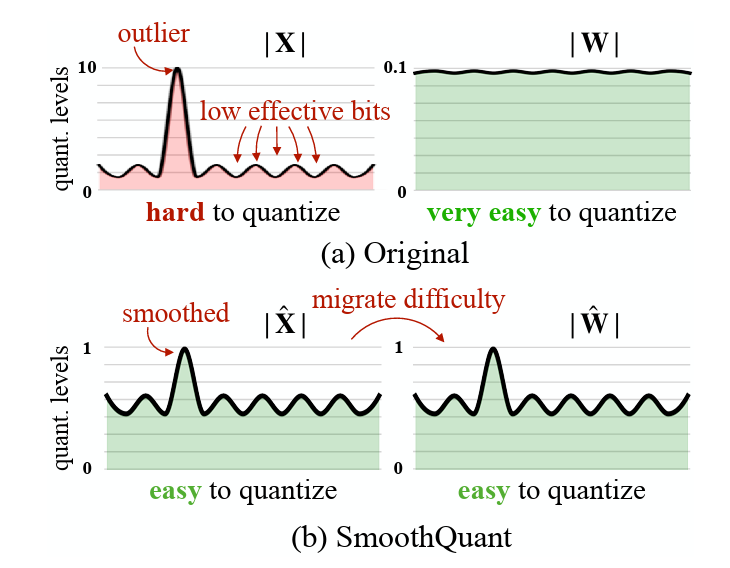 - 右侧:应用SmoothQuant后,激活值中的异常值被大幅平滑,所有通道的幅度变得相对均衡;权重虽然引入了一些变化,但整体仍然保持较为均匀的分布