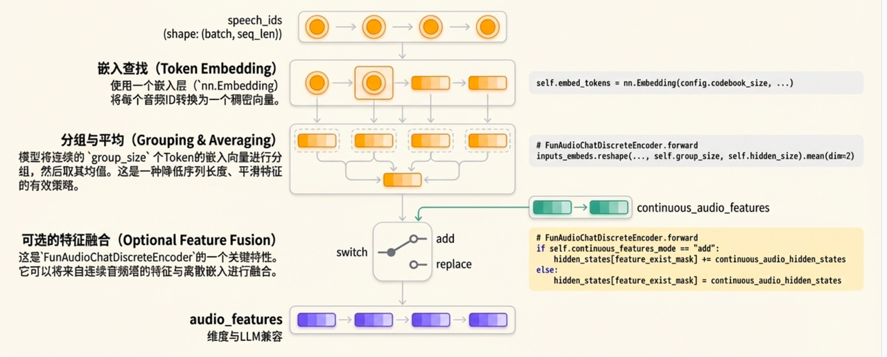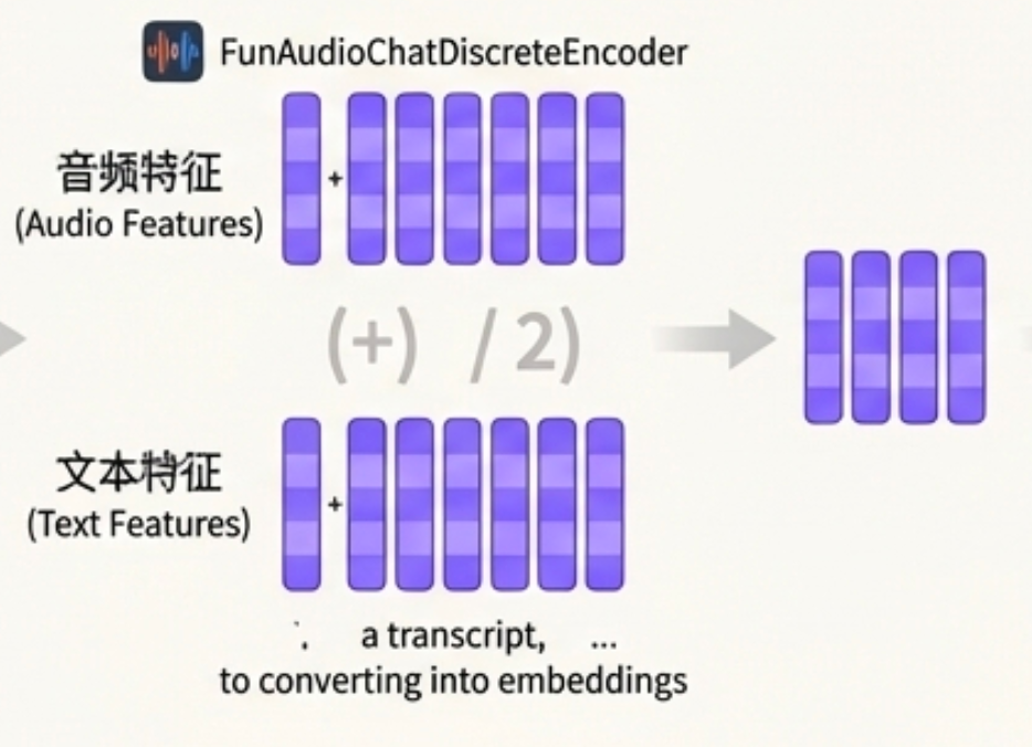 - 每个生成的文本token的embedding 和 融合后的音频表示 融合(mean)