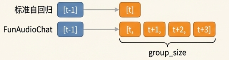 具体来说:模型每一步解码,同时产生1个文本token和5个音频token (group_size=5)