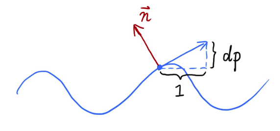 2D 平面场景:原始法向量 n §=(0,1),导数 dp=c・[h (p+1)-h §],扰动后法向量 n §=(-dp,1)(归一化)。