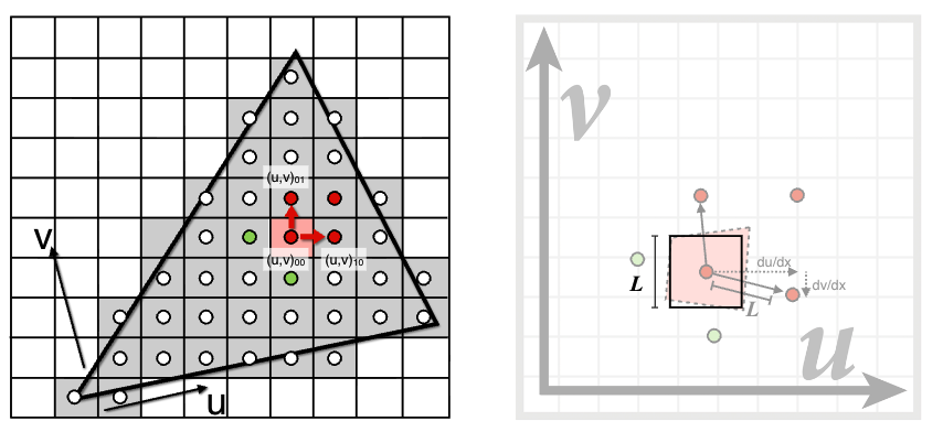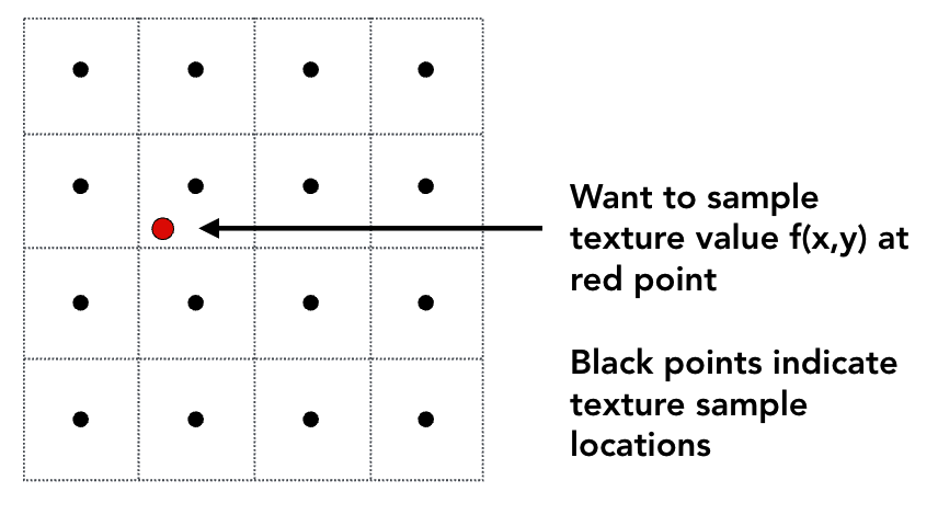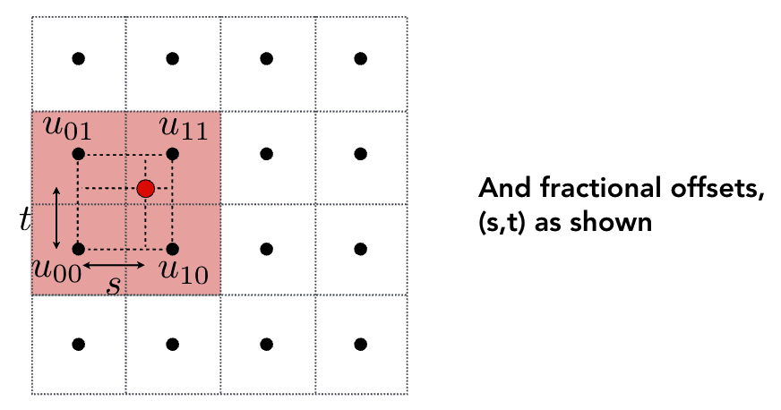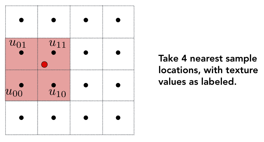 目标 :想要在红点处对纹理值 f ( x , y ) f(x,y) f(x,y) 进行采样,黑点表示纹理样本位置。