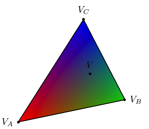 通过重心坐标可插值顶点的任意属性(记顶点属性为 V A , V B , V C V_A, V_B, V_C VA,VB,VC),插值公式: V = α V A + β V B + γ V C V = \alpha V_A + \beta V_B + \gamma V_C V=αVA+βVB+γVC