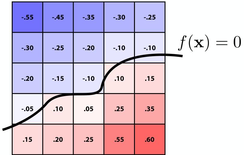 闭式方程难以描述复杂形状。替代方案:存储一个近似函数的值网格。在插值值等于零的地方可以找到曲面,提供对形状更明确的控制(如纹理)。