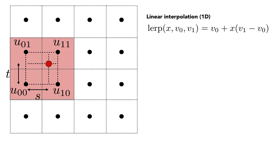 - 1D 线性插值公式(lerp): l e r p ( x , v 0 , v 1 ) = v 0 + x ( v 1 − v 0 ) lerp(x, v_0, v_1) = v_0 + x(v_1 - v_0) lerp(x,v0,v1)=v0+x(v1−v0);