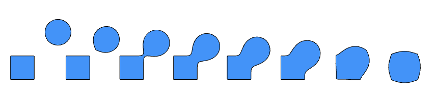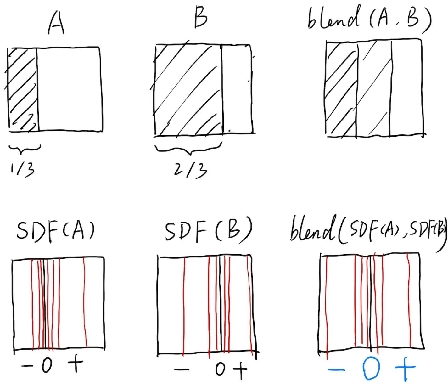 不使用布尔值,而是使用距离函数将曲面逐渐融合在一起:给出从任意位置到物体的最小距离(可以是带符号的距离)。