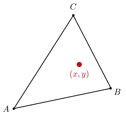重心坐标是三角形专属的坐标系,对于三角形内任意一点 ( x , y ) (x, y) (x,y),可表示为三个顶点的线性组合: ( x , y ) = α A + β B + γ C (x, y) = \alpha A + \beta B + \gamma C (x,y)=αA+βB+γC