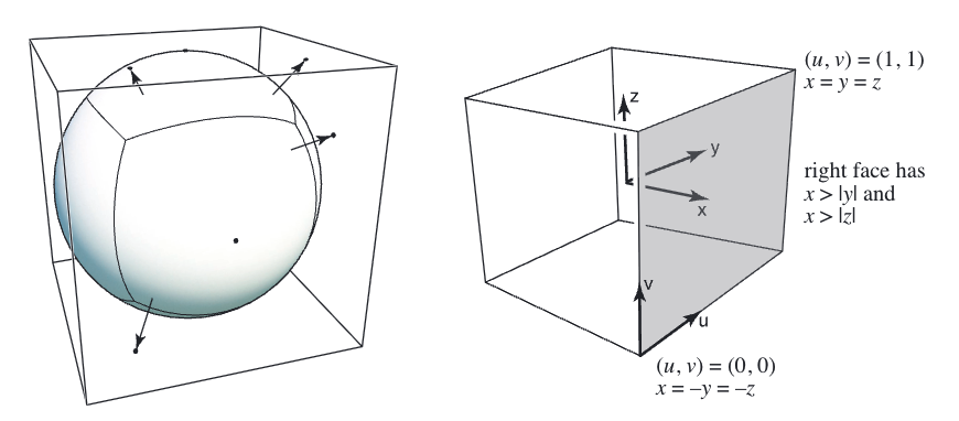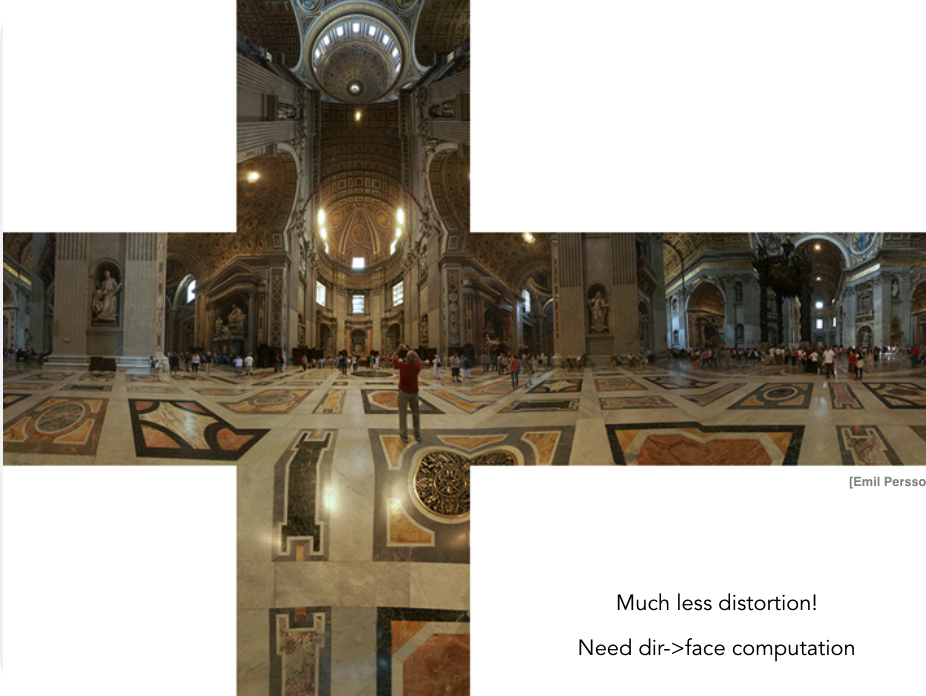 2️⃣ 立方体贴图(Cube Map):由 6 张正方形纹理组成,将方向向量映射到立方体表面,畸变显著减少;需进行 "方向→面" 的计算(参考 Emil Persson 的研究)。