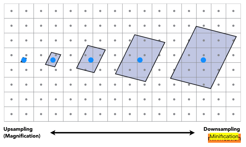 问题本质:单个屏幕像素对应纹理中的不足 1 个纹素(texel),需插值补充(纹理尺寸 < 屏幕显示尺寸)。