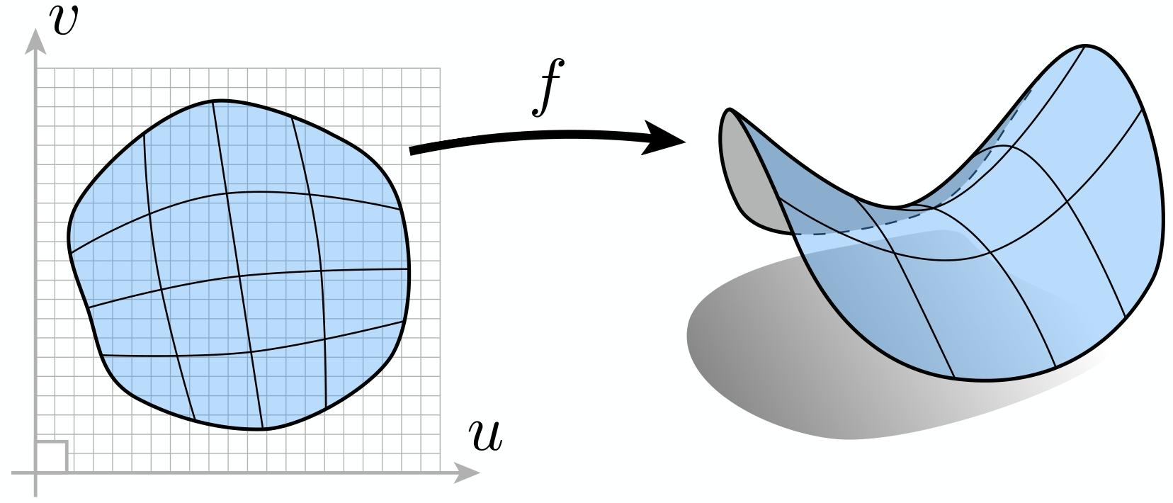 核心定义 :直接给出所有点或通过参数映射生成点,通用形式为 f:ℝ²→ℝ³;(u,v)↦(x,y,z)。