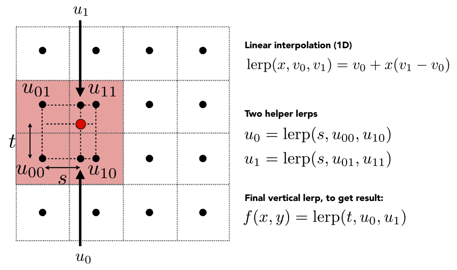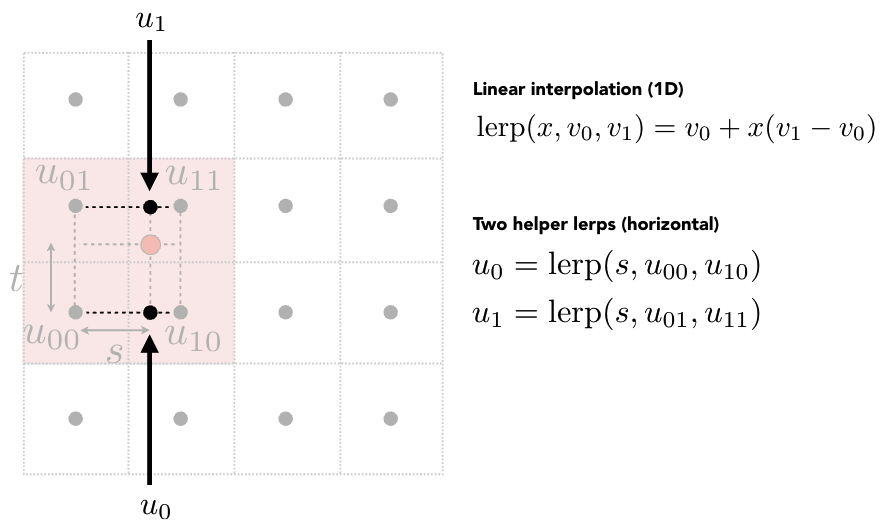 - 水平插值: u 0 = l e r p ( s , u 00 , u 10 ) u_0 = lerp(s, u_{00}, u_{10}) u0=lerp(s,u00,u10), u 1 = l e r p ( s , u 01 , u 11 ) u_1 = lerp(s, u_{01}, u_{11}) u1=lerp(s,u01,u11);