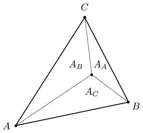 重心坐标的三个分量对应 "子三角形面积" 与 "原三角形总面积" 的比值: α = A A A A + A B + A C , β = A B A A + A B + A C , γ = A C A A + A B + A C \alpha = \frac{A_A}{A_A + A_B + A_C}, \quad \beta = \frac{A_B}{A_A + A_B + A_C}, \quad \gamma = \frac{A_C}{A_A + A_B + A_C} α=AA+AB+ACAA,β=AA+AB+ACAB,γ=AA+AB+ACAC
