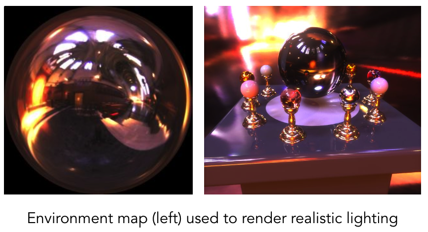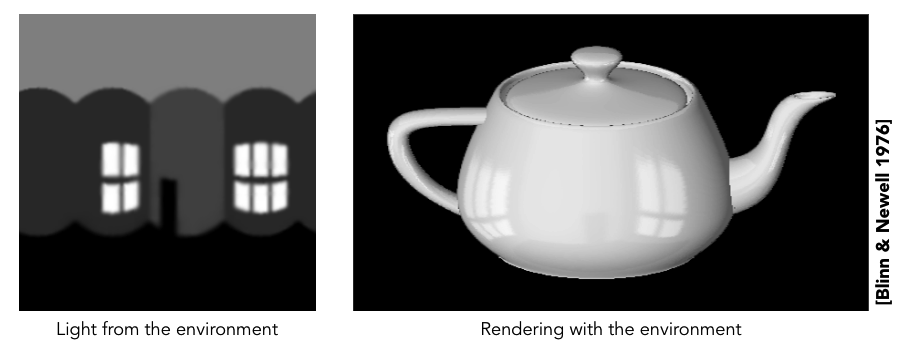 利用环境贴图(Environment Map)模拟环境光源,实现真实感光照渲染(源自 Blinn & Newell 1976 年的研究)。