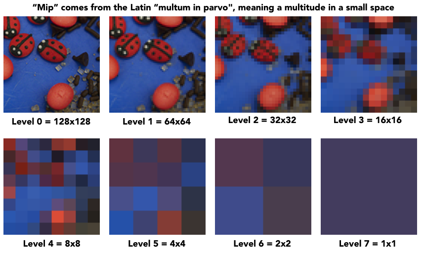核心思想:预计算多分辨率纹理层级,快速获取区域平均值(替代点采样)。名字来源:拉丁语 "multum in parvo",意为 "小空间容纳多内容"。