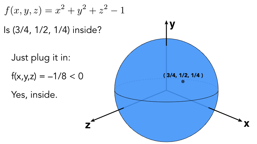 优势任务:内部 / 外部判断(直接代入函数计算,f<0 为内部,f>0 为外部)、光线与表面相交计算(后续讲解)、拓扑变化处理(如流体)、简单形状的精确描述(无采样误差)。