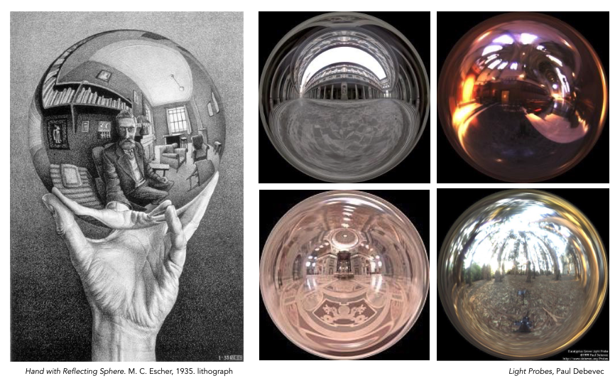 1️⃣ 球形环境贴图(Spherical Environment Map):存在畸变问题(顶部和底部区域尤为明显),典型例子如埃舍尔的《手持反射球》。