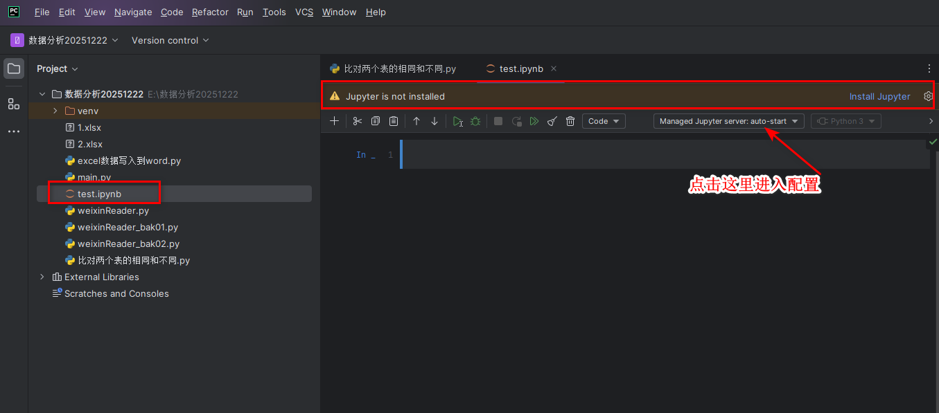 2、打开pycharm,新建一个jupyter notebook文件,发现报错,提示未安装,按图点击进入配置。