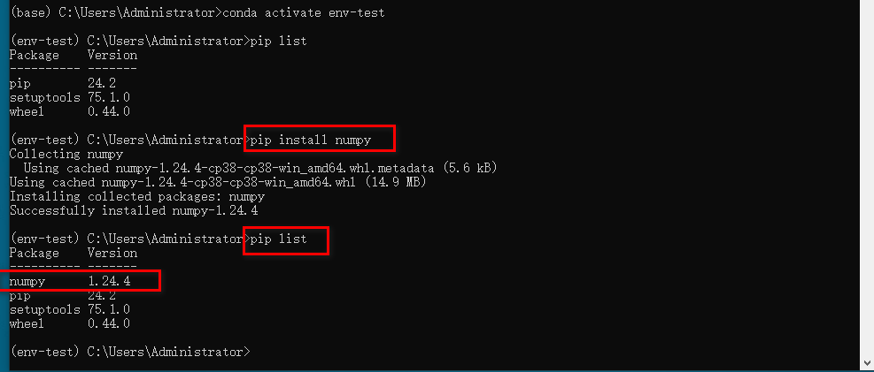 4、进入到 env-test虚拟环境后就可以在此环境中安装需要的包,例如,这里安装numpy包,则输入命令 pip install numpy