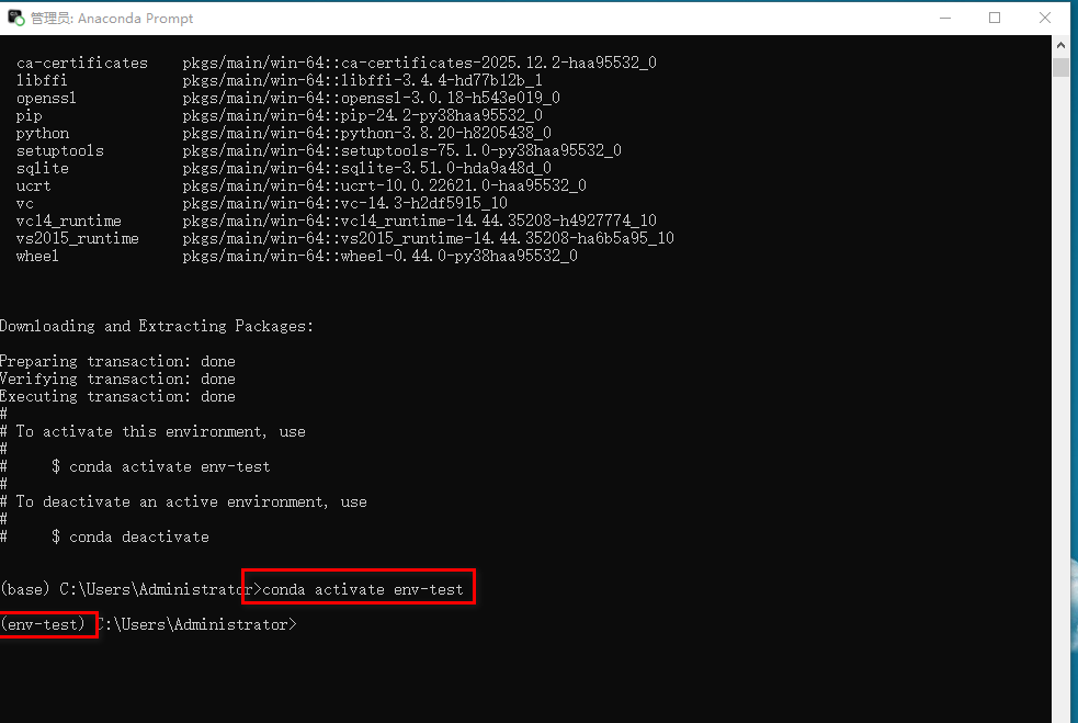 3、创建成功后,输入命令 conda activate env-test 后按下回车键进入到此虚拟环境(即 激活虚拟环境)