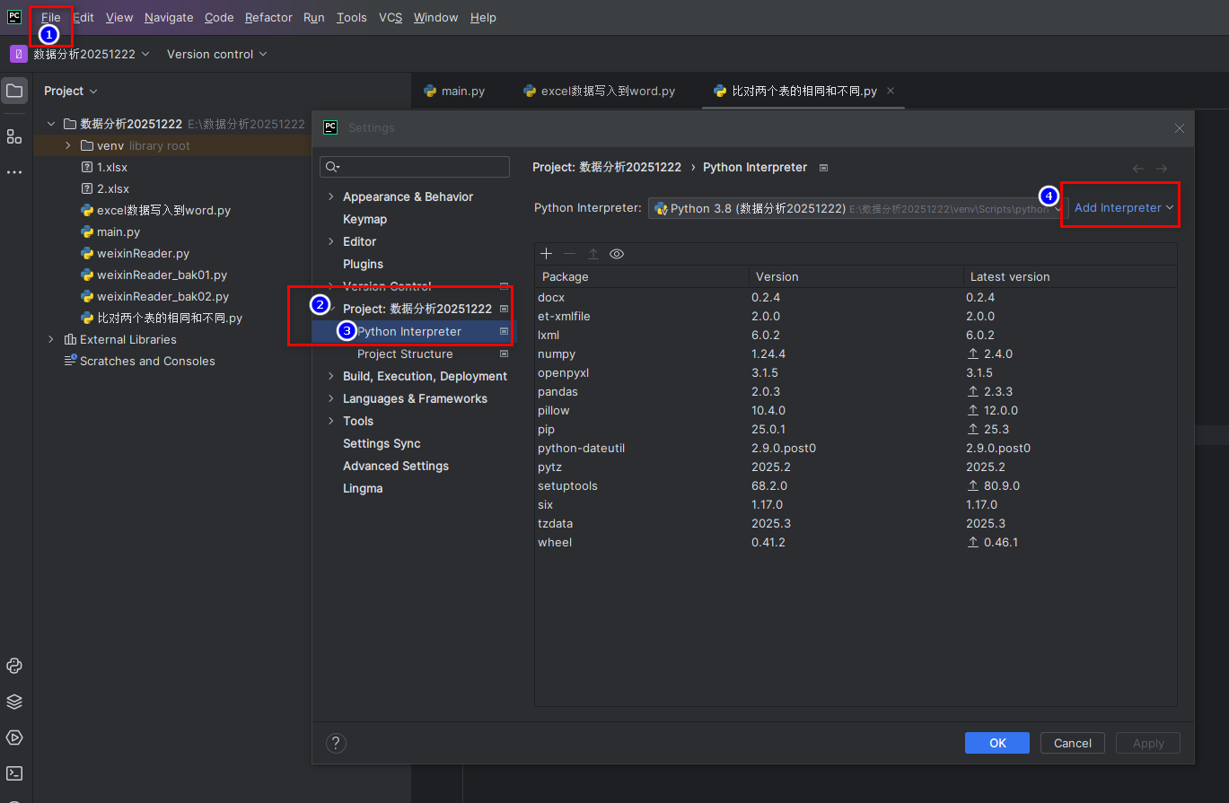 1、pycharm-File-settings-project-python interpreter ,找到这个设置,这个设置就是自己当前项目的解释环境设置。