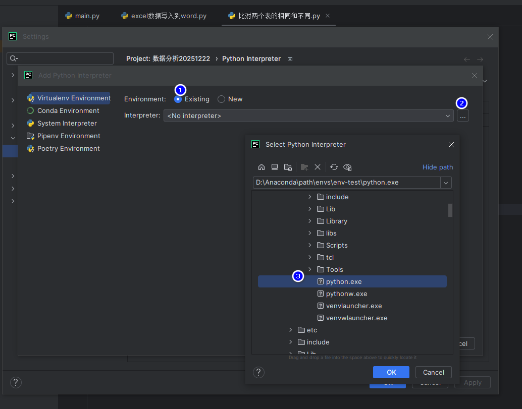 2、然后如上图,在点击 Add Interpreter ,添加新的解释环境。点击 Add Local Interpreter ,选择 Existing (已经存在的环境),下面的路径选择上面提到的anaconda安装路径中 envs 文件夹中的python.exe,点击OK就可以了。