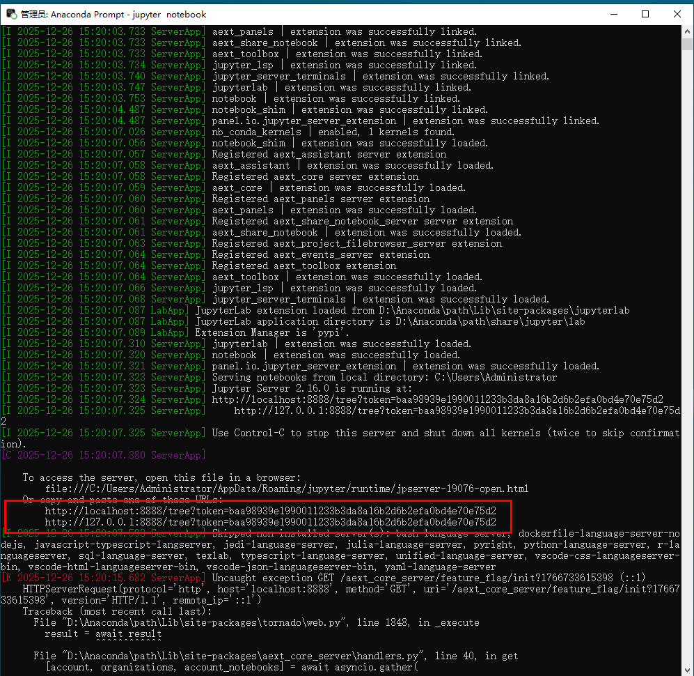 打开Anaconda Prompt终端,输入启动命令:jupyter notebook,如图,终端中显示 Jupyter Notebook 服务器的 URL 地址(通常是 http://localhost:8888/),复制如下任一链接(包括token部分);