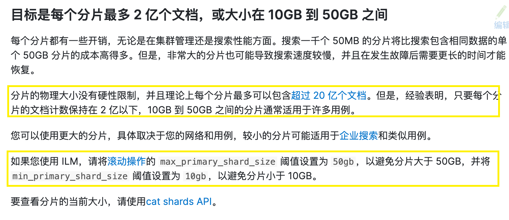 1、Aim for shard sizes between 10GB and 50GB 【每一个分片大小10-50GB】