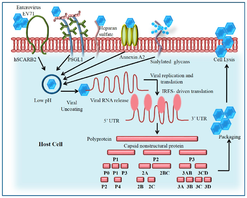 附着与内化:病毒通过VP1与宿主细胞膜上的特异性受体结合,通过网格蛋白介导的内存作用进入细胞。