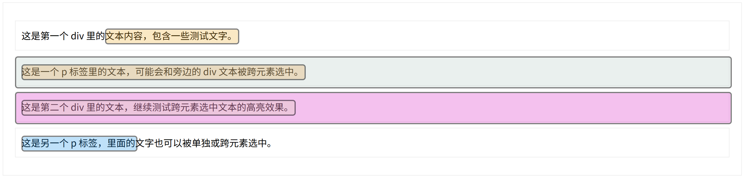 其中parseRectsAndTextFromSelection()先通过递归的方式获取选中元素最内层的文本,然后获取选中文字所占区域,在该区域创建一个div,设置颜色,透明度,遮罩在文本上方,实现高亮的效果。