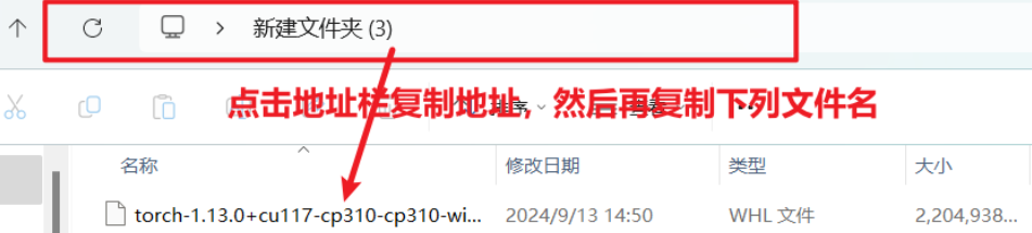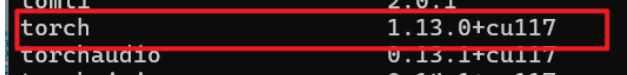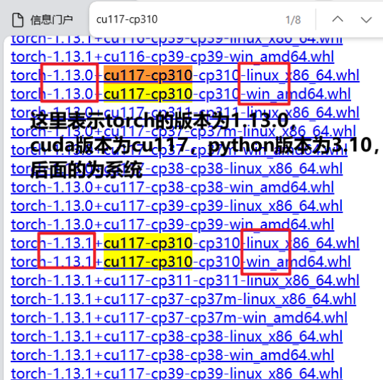 可以使用网页查找命令,长按ctrl+F,然后输入需要的版本,cu表示安装的cuda版本,cp表示python版本,例如下图所示,我下载的是torch1.13.0,cuda版本可以比安装的版本低,但是不能比安装的版本高,python版本为3.10,python版本可以在命令提示符内输入命令python或者where python查看,如下图所示