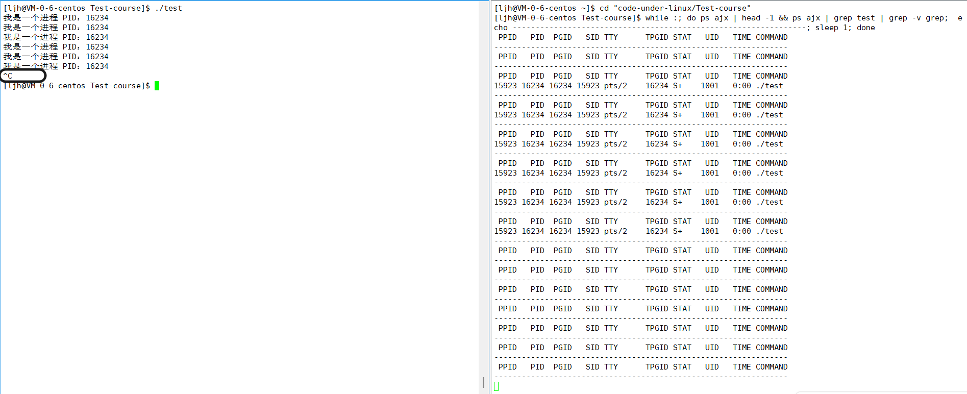 while :; do ps ajx | head -1 && ps ajx | grep mytouch | grep -v grep;
