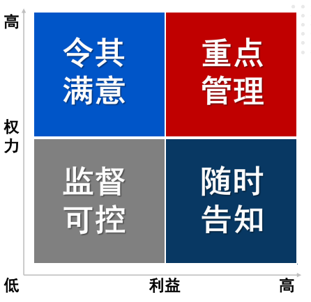 | 第二象限(左上) | 次要干系人 | 高权力 + 低利益 | 保持满意(Keep Satisfied) | 公司高层领导(不关注细节,但有资源审批权)、合规部门(仅关注合规性,不参与执行) | 需定期同步关键节点(如合规评审结果),避免其因 "被忽视" 而干预项目 |