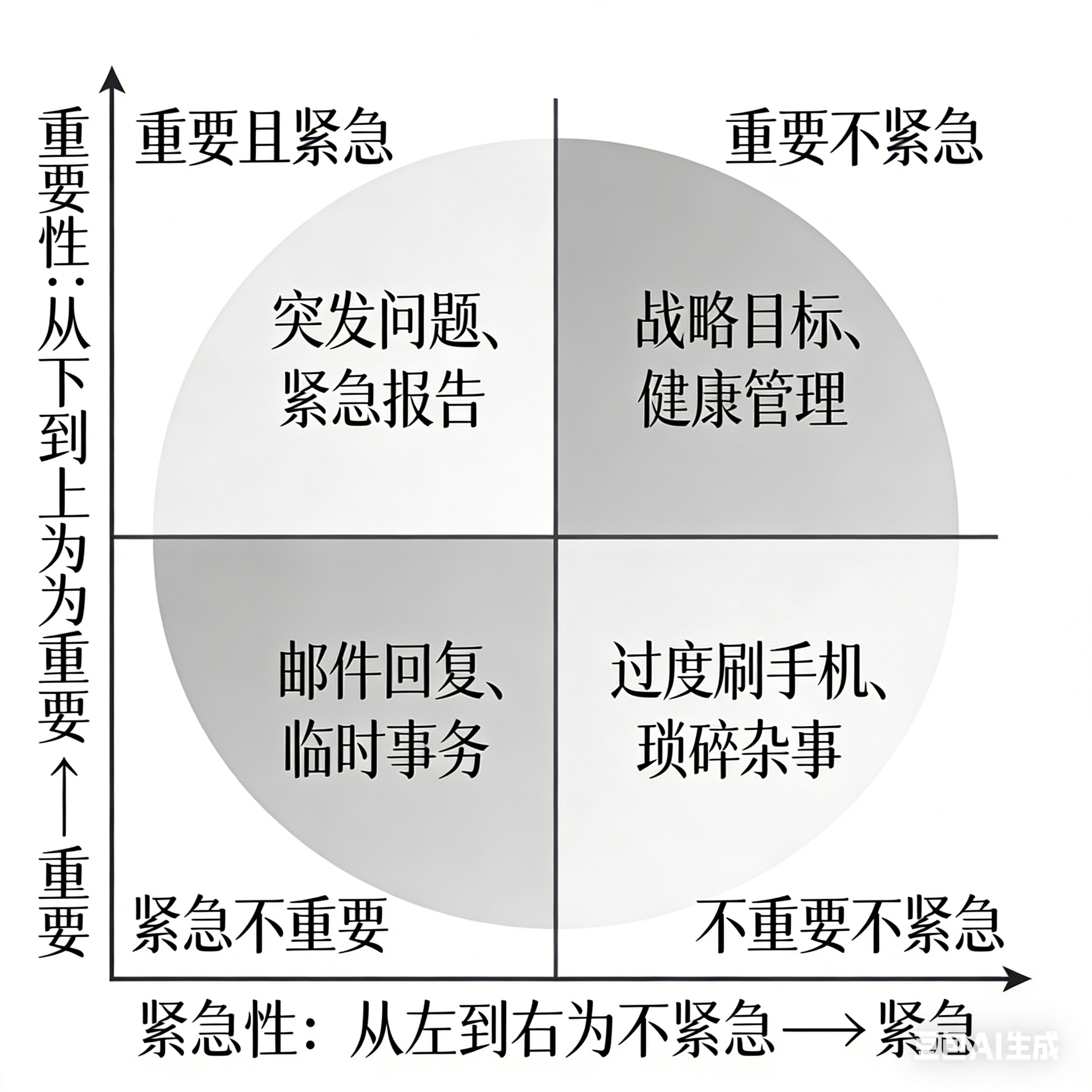 | 第四象限:不重要不紧急 | 浪费时间 | 刷短视频、无效社交 | 坚决避免 |