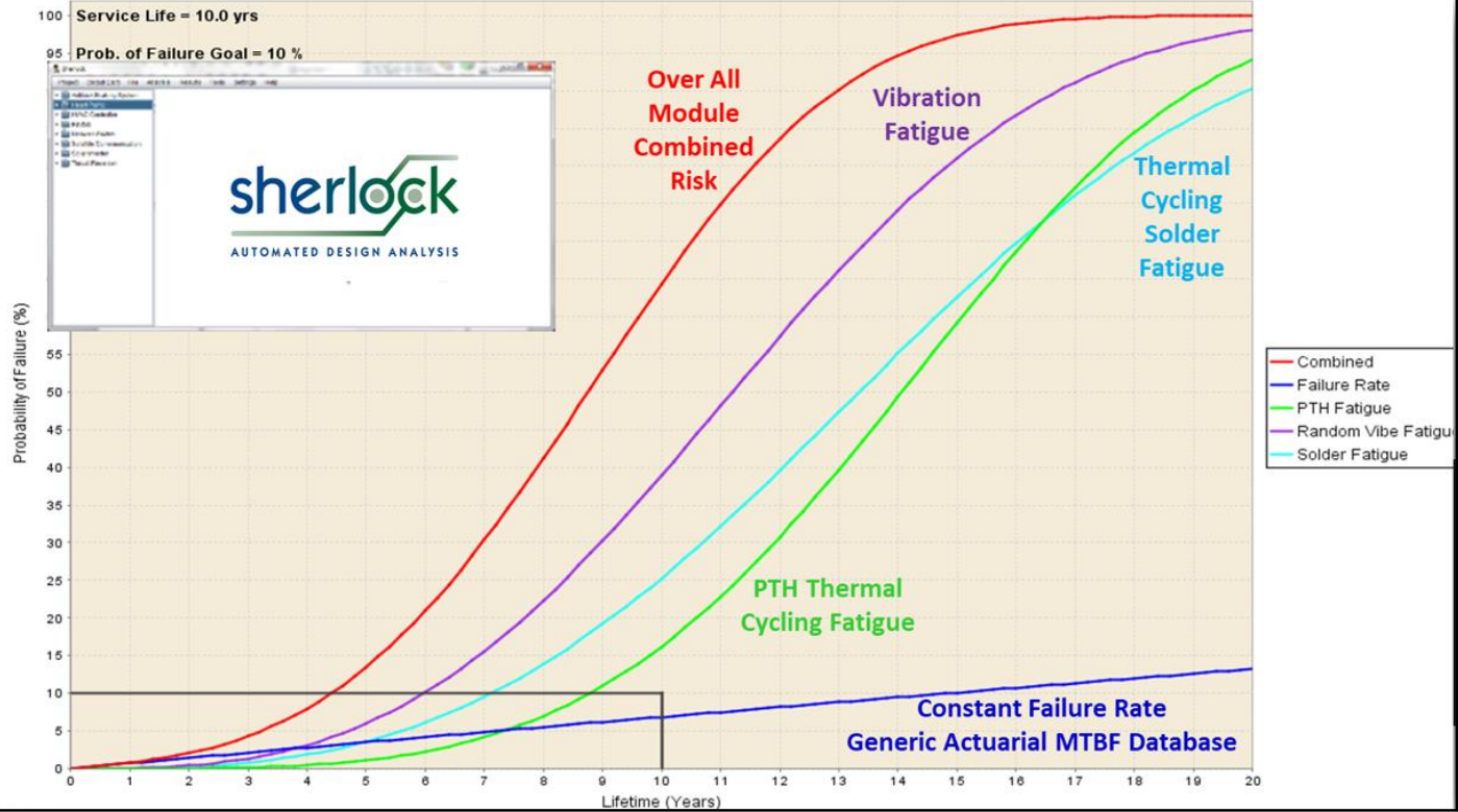 Sherlock用于电子设备可靠性验证;热循环疲劳、焊料回流故障、随机振动、机械冲击等;在PCB的寿命内估计组合失效概率。