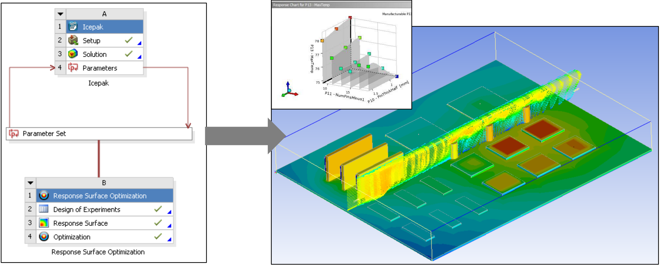 Icepak可以与DesignXplore(DX)相结合,以创建一个鲁棒性好的设计解决方案