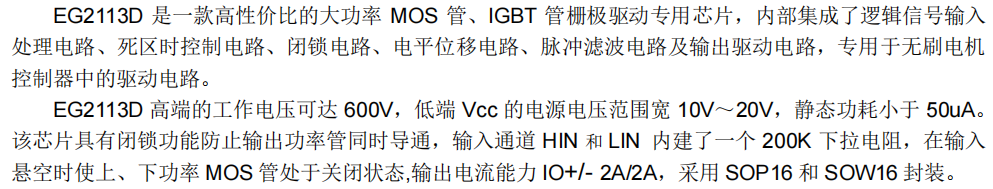 在无刷电机驱动、逆变电源、工业变频等高要求场合,EG2113D 是一款兼具性能与可靠性的栅极驱动解决方案