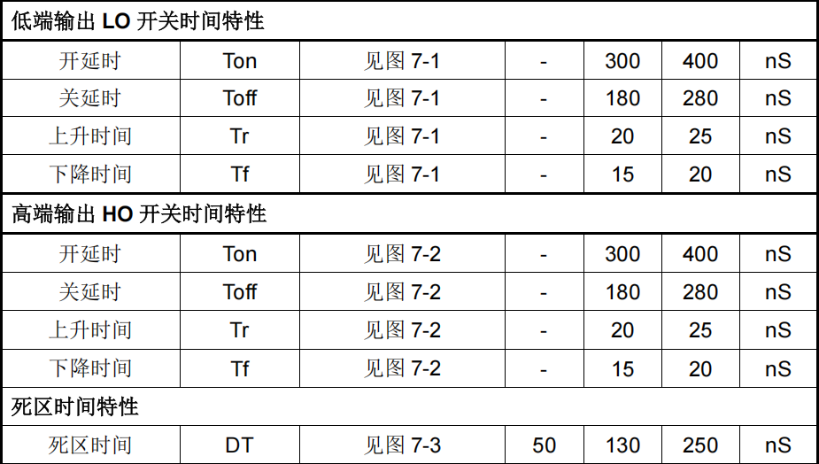 下降时间(Tf):典型 15ns,最大 20ns - 死区时间(DT):典型 130ns(范围 50ns--250ns),内置防直通闭锁