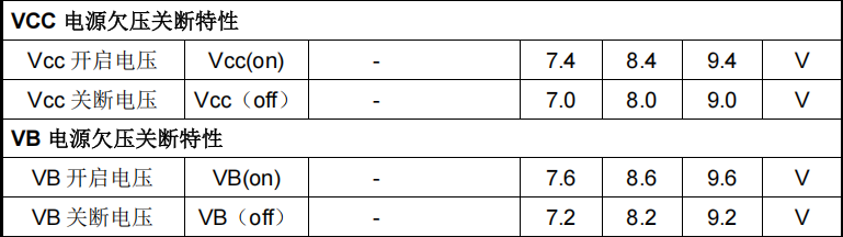 关断阈值:典型 8.0V(范围 7.0V--9.0V) - VB 欠压保护: