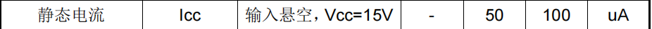 - 静态电流(ICC):典型 50μA,最大 100μA(输入悬空,VCC=15V