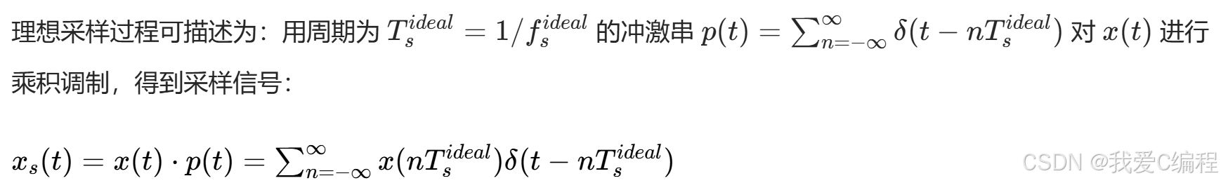 根据奈奎斯特采样定理,对一个最高频率为fm的连续时间信号x(t),理想采样率fsideal 需满足fsideal≥2*fm。
