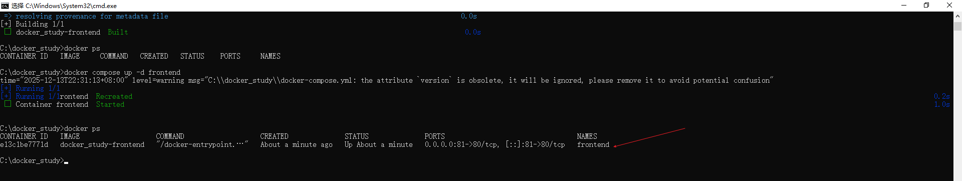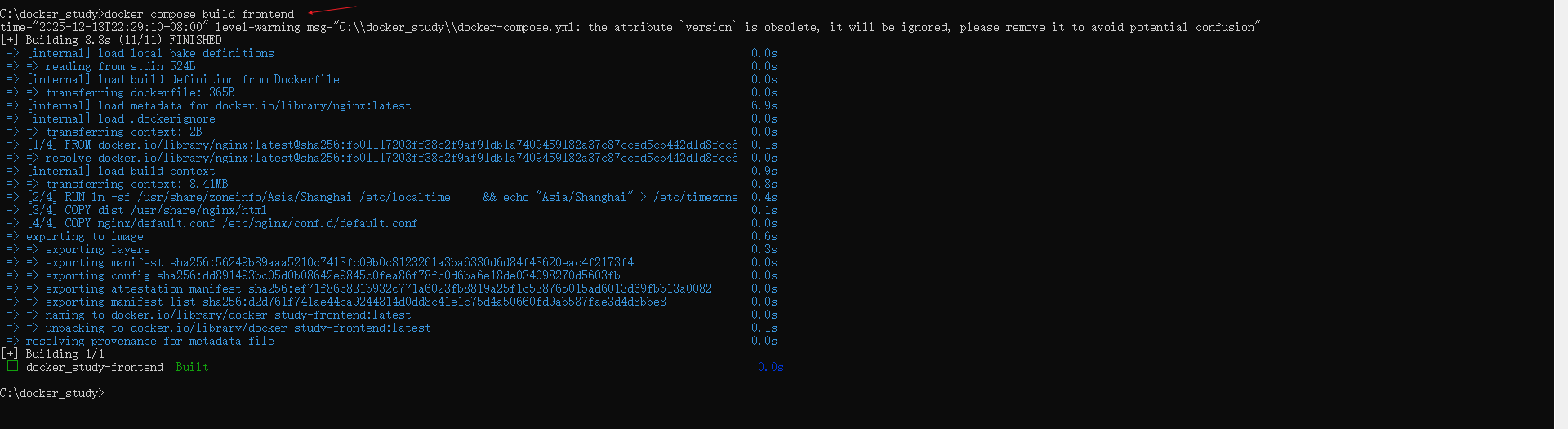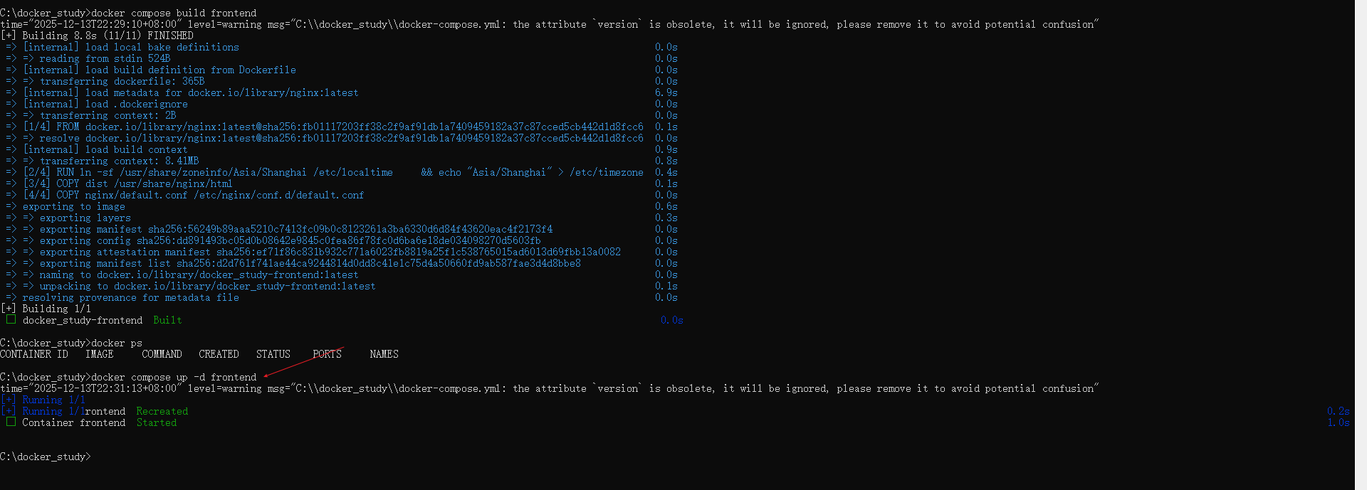 说明:frontend 服务构建 Docker 镜像,而不启动容器。