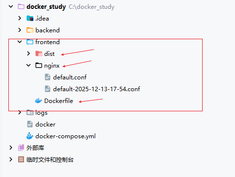 build:从本地./frontend目录构建镜像,使用该目录下的 Dockerfile。container_name:容器名称设置为frontend。ports:将宿主机 81 端口映射到容器的 80 端口(Nginx 默认端口)。volumes:将宿主机./logs/frontend目录挂载到容器的/var/log/nginx,方便查看 Nginx 日志。
