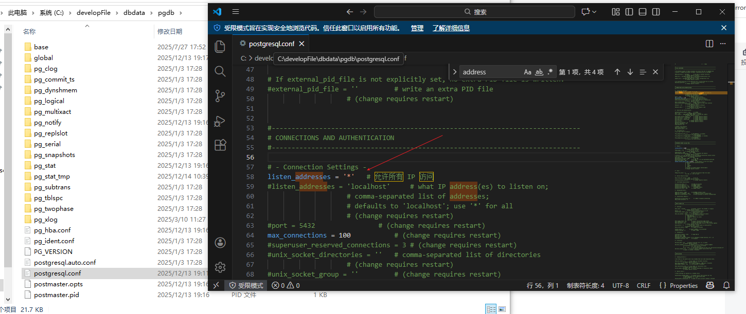 说明:psql: 无法联接到服务器: Connection refused (0x0000274D/10061) 服务器是否在主机 "host.docker.internal"(192.168.31.158) 上运行并且准备接受在端口 5432 上的 TCP/IP 联接。修改 PostgreSQL 配置允许 TCP/IP 连接,允许所有 IP 连接。添加如下: