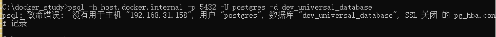 说明:psql: 致命错误: 没有用于主机 "192.168.31.158", 用户 "postgres", 数据库 "dev_universal_database", SSL 关闭 的 pg_hba.conf 记录。